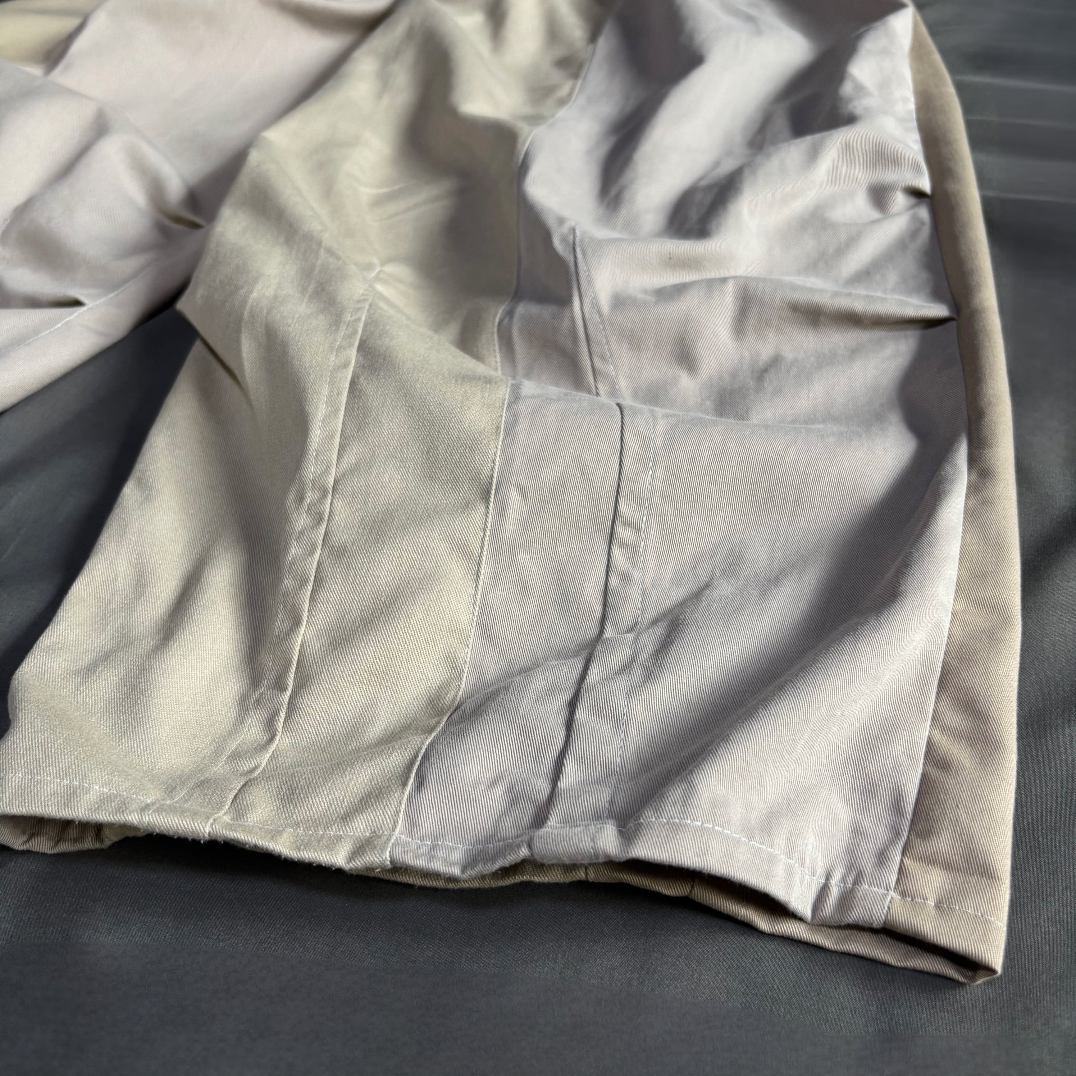 Elastic waist with belt loops. Hem shortening available upon request.