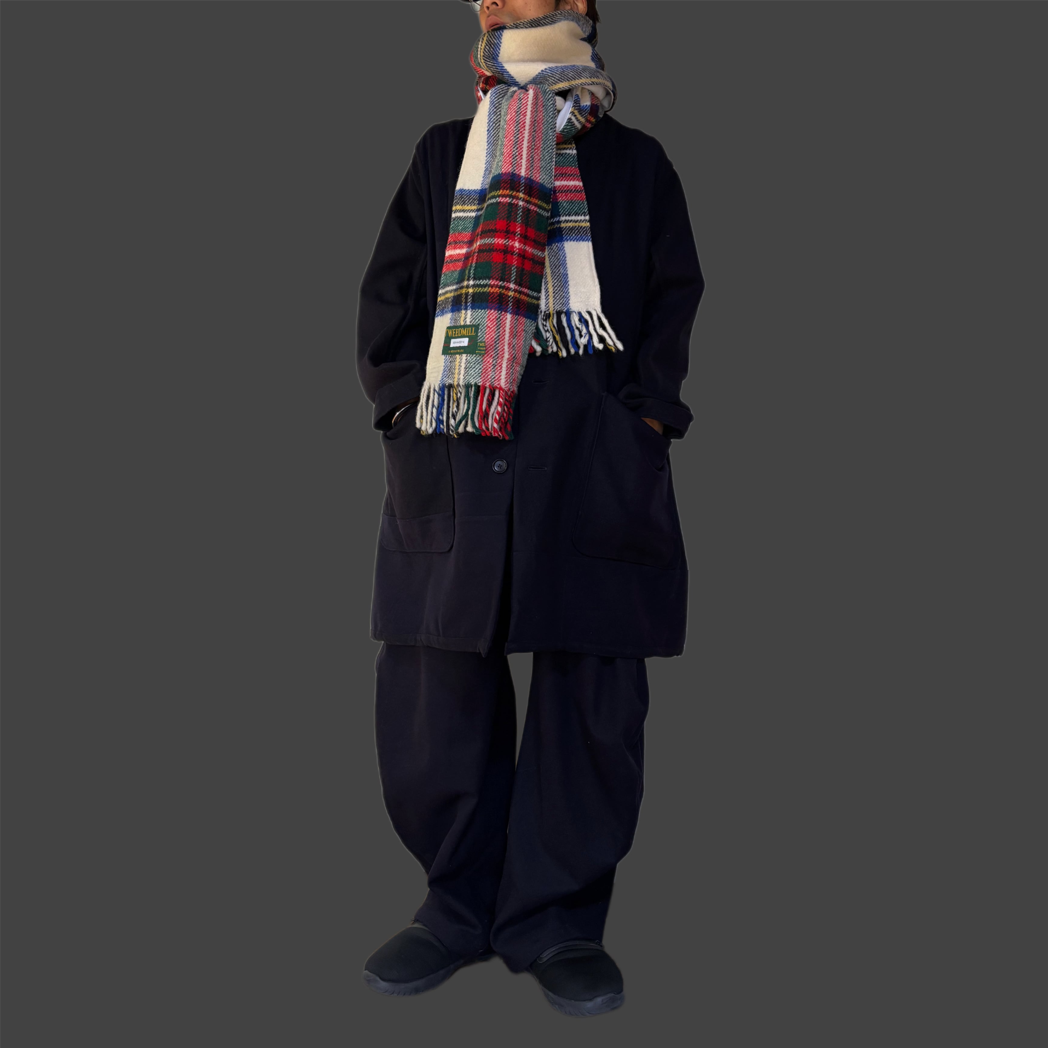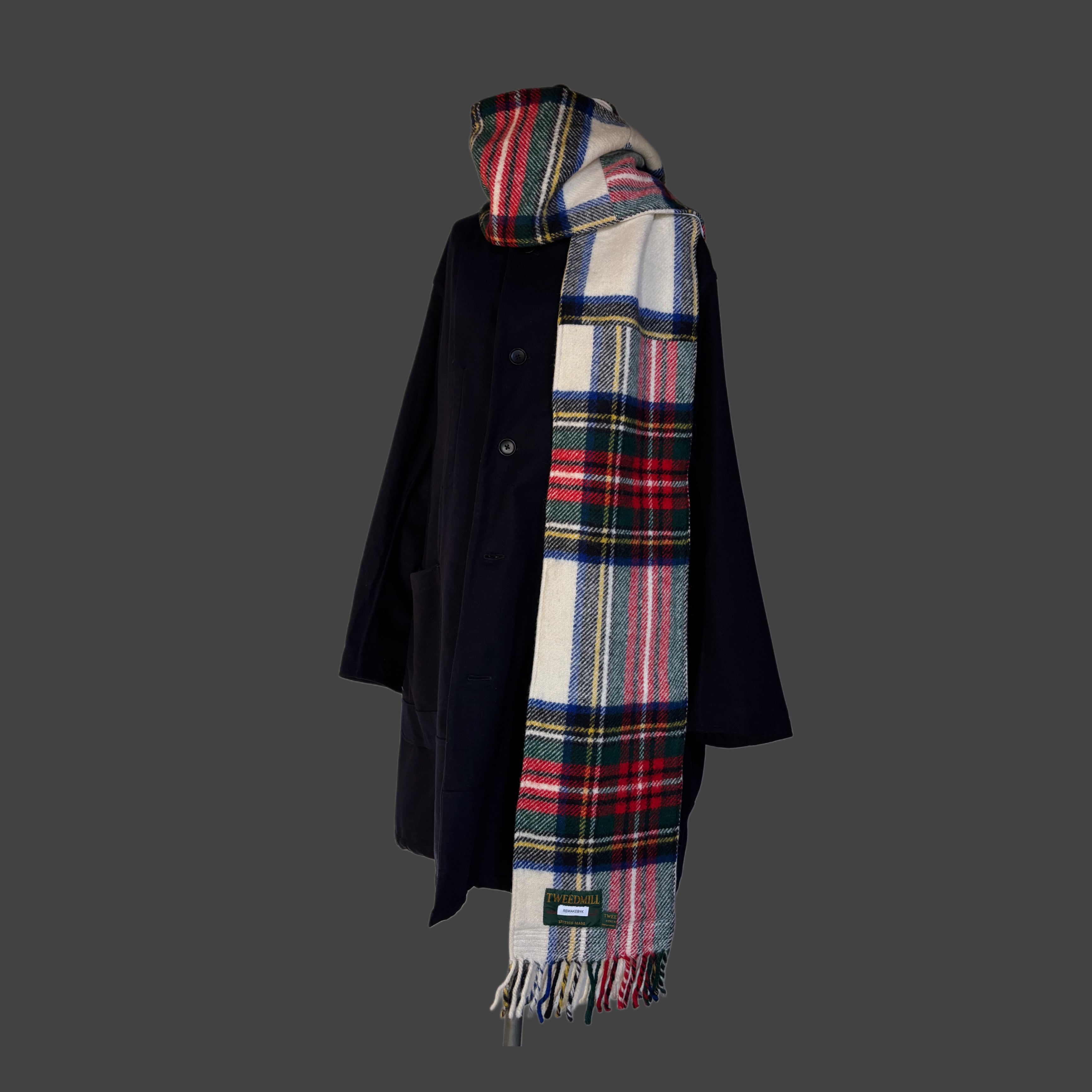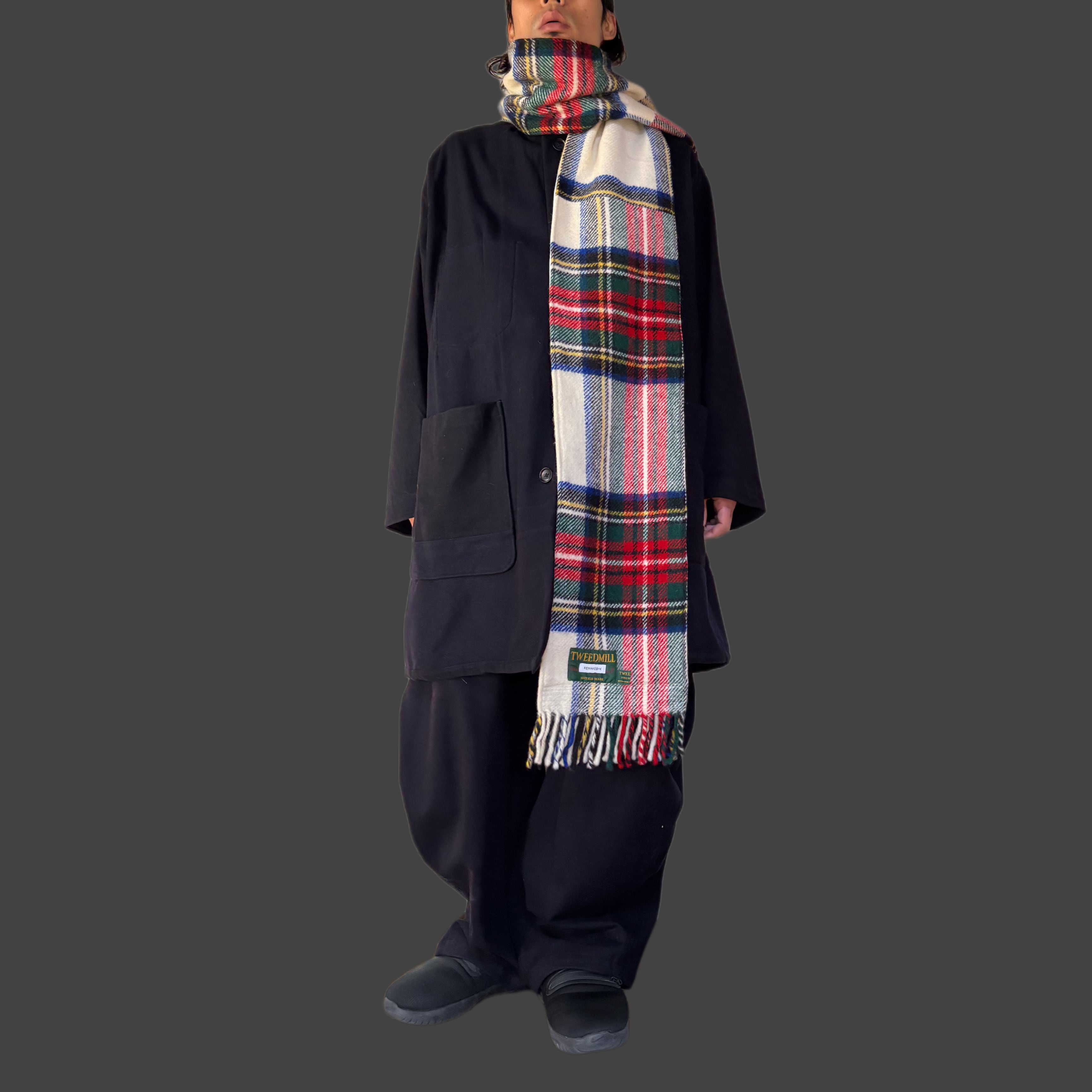 表に重厚なタータン、裏に90年代のスウェットを使用。