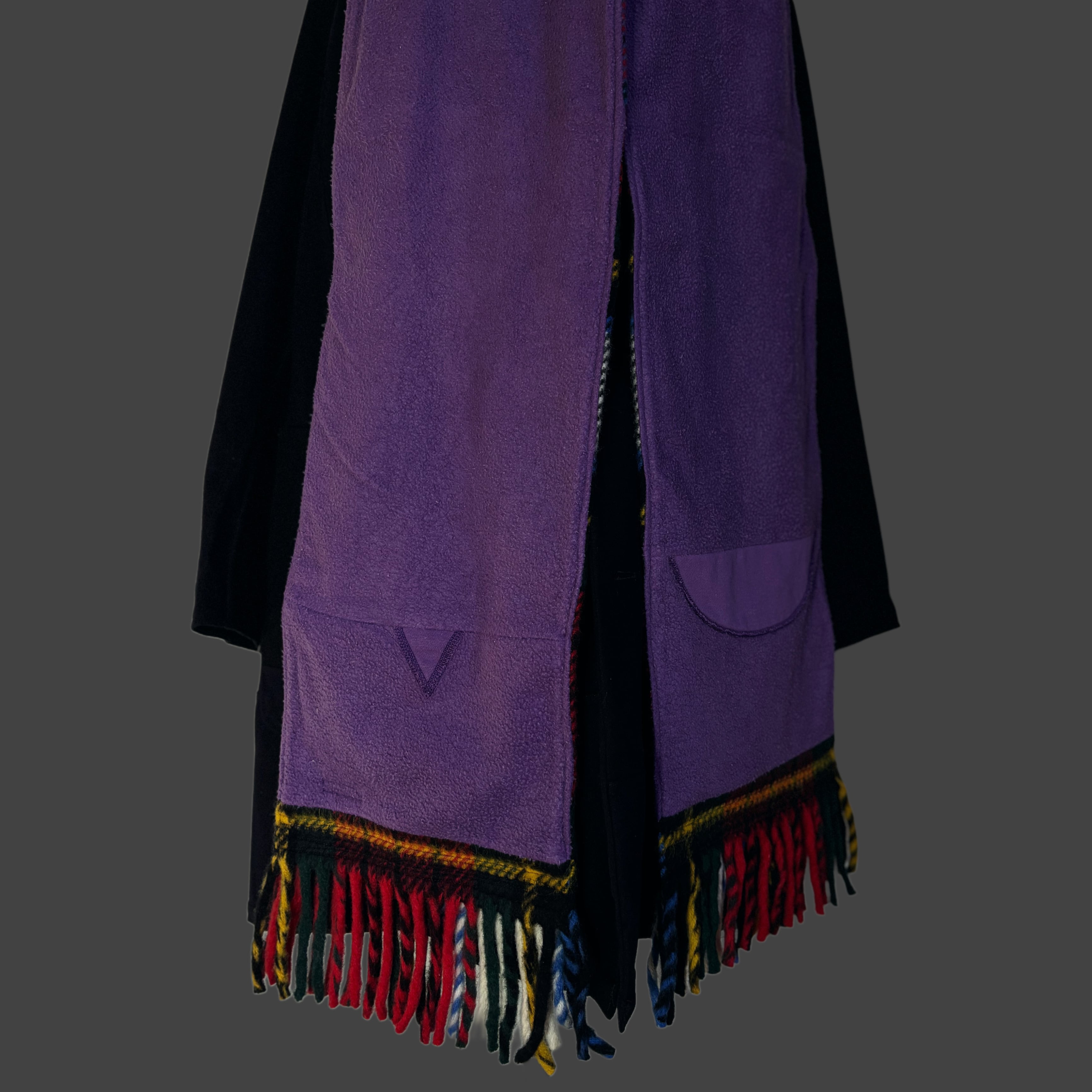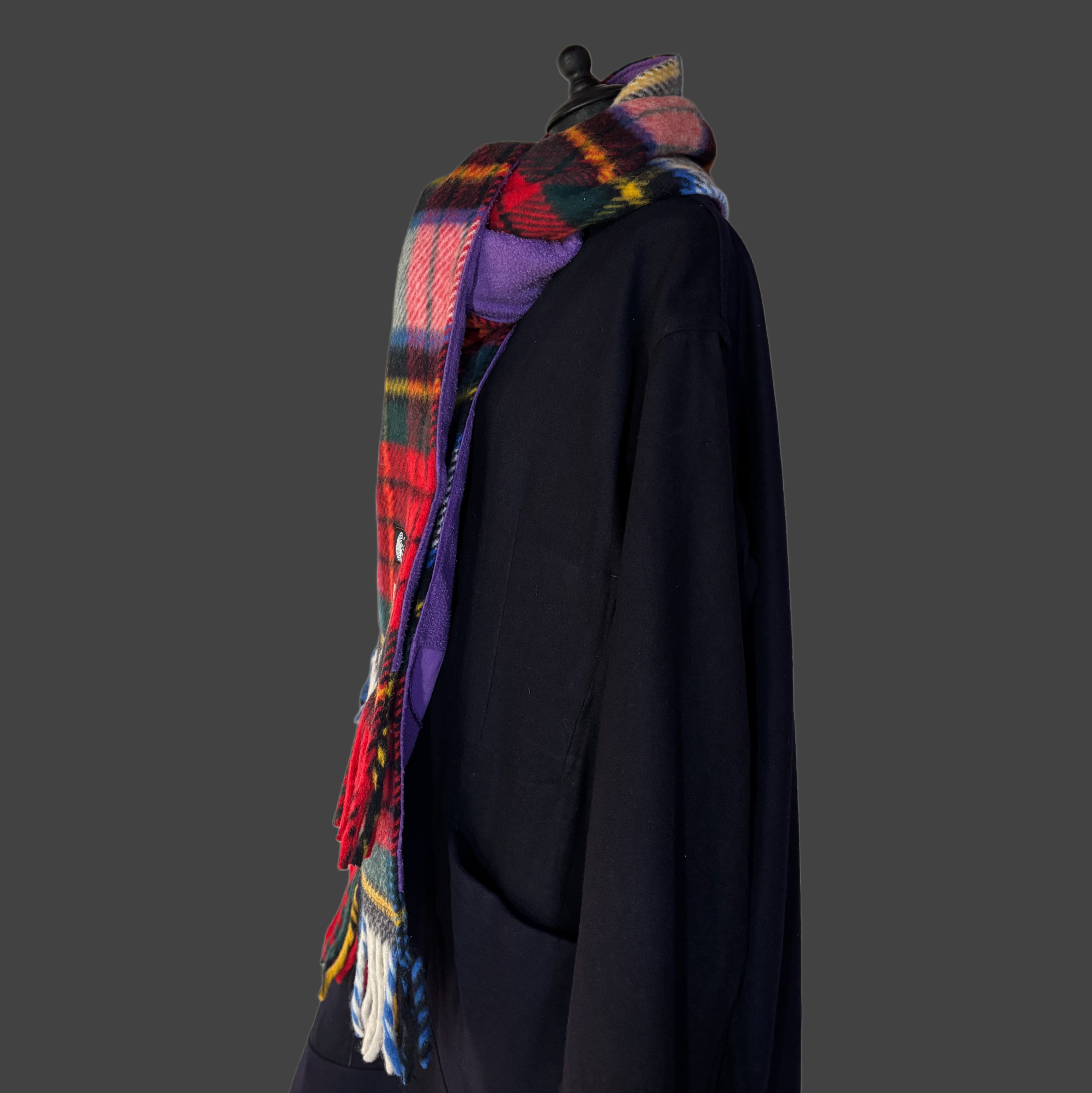 The outer layer features a heavy tartan, while the reverse uses a 90s sweatshirt fabric.