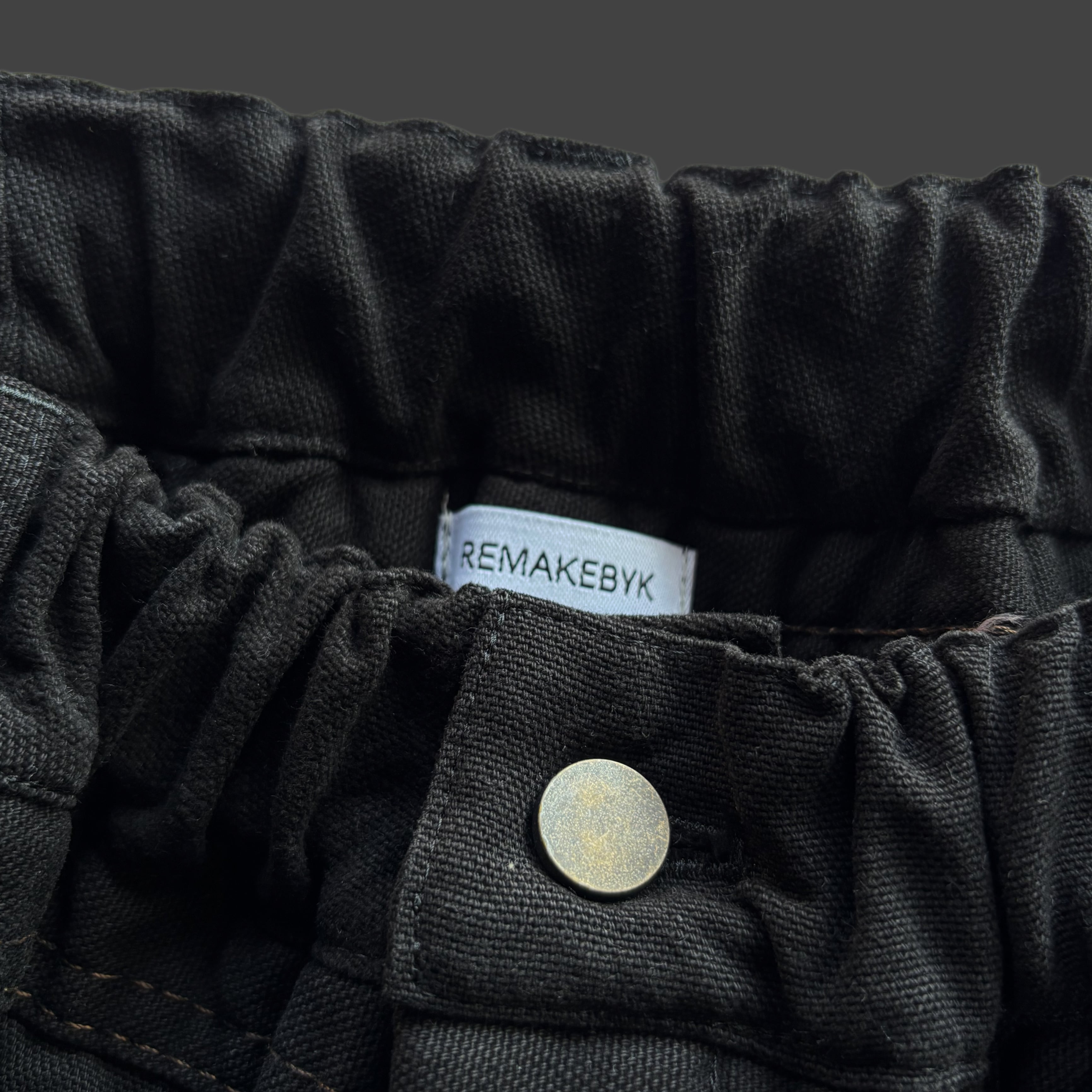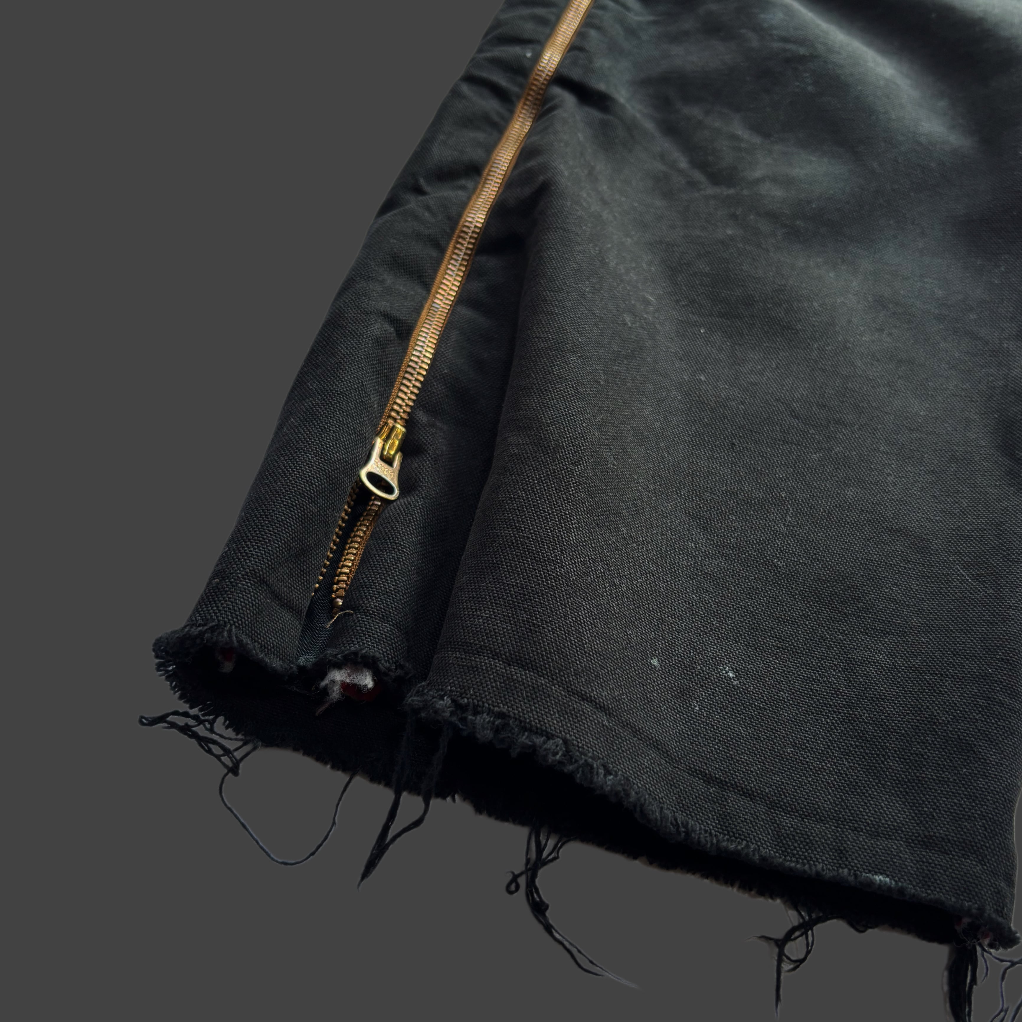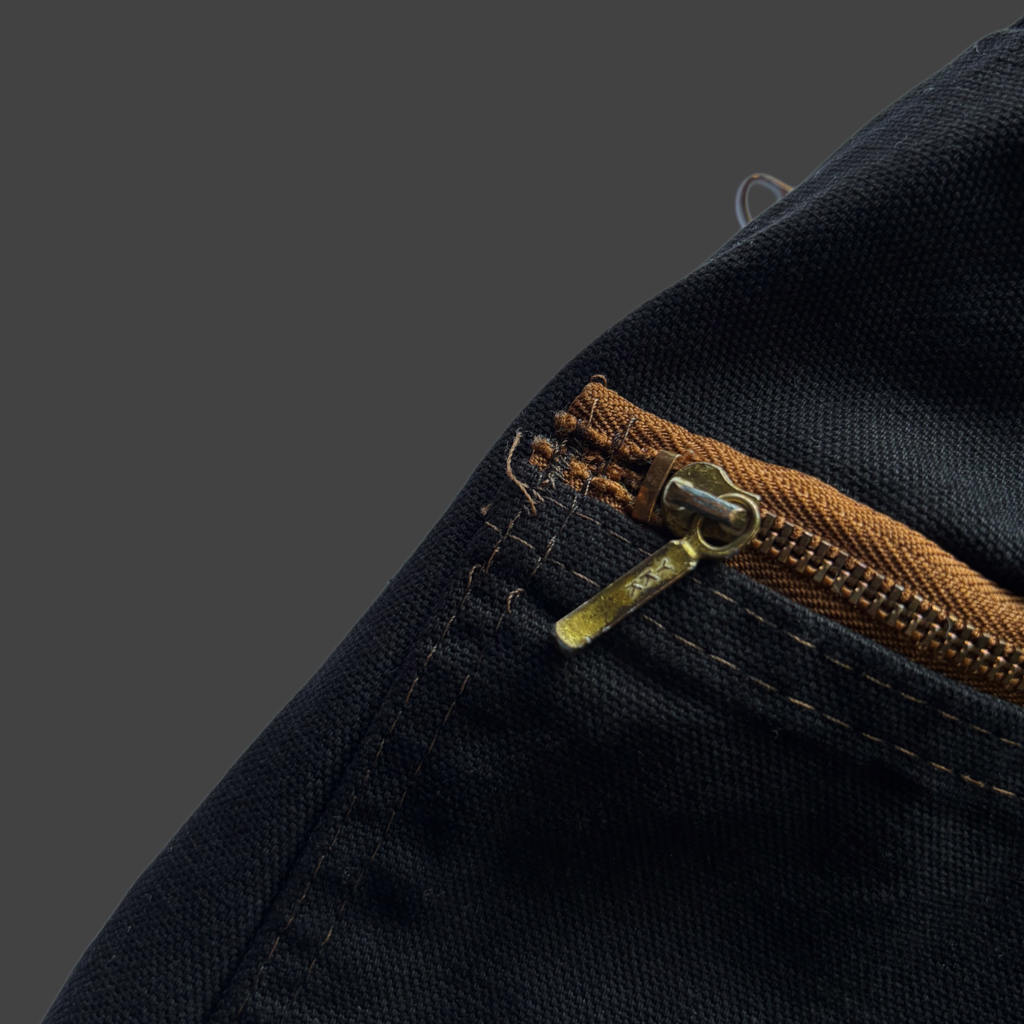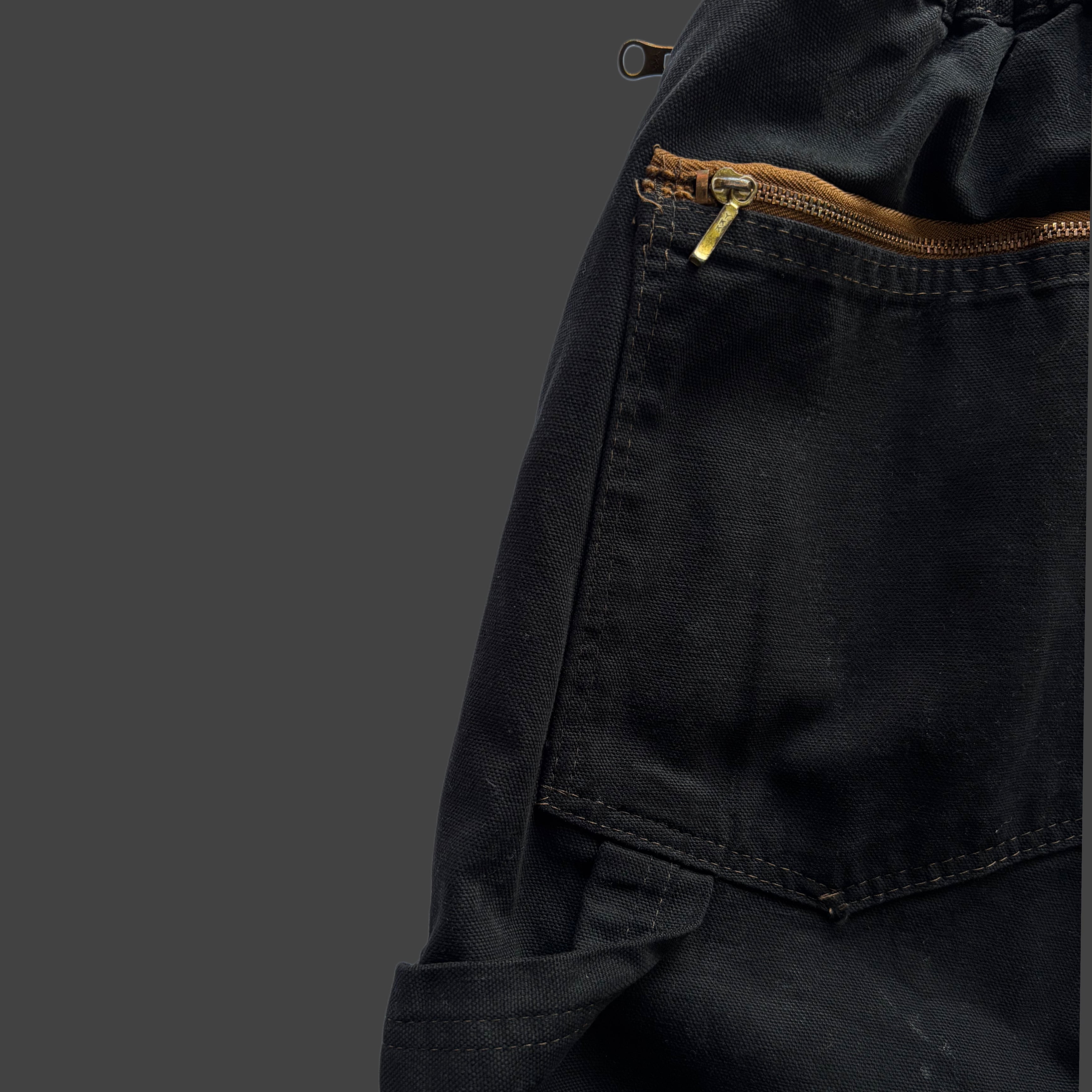 Deconstructed from vintage duck overalls, reconstructed, and overdyed black.