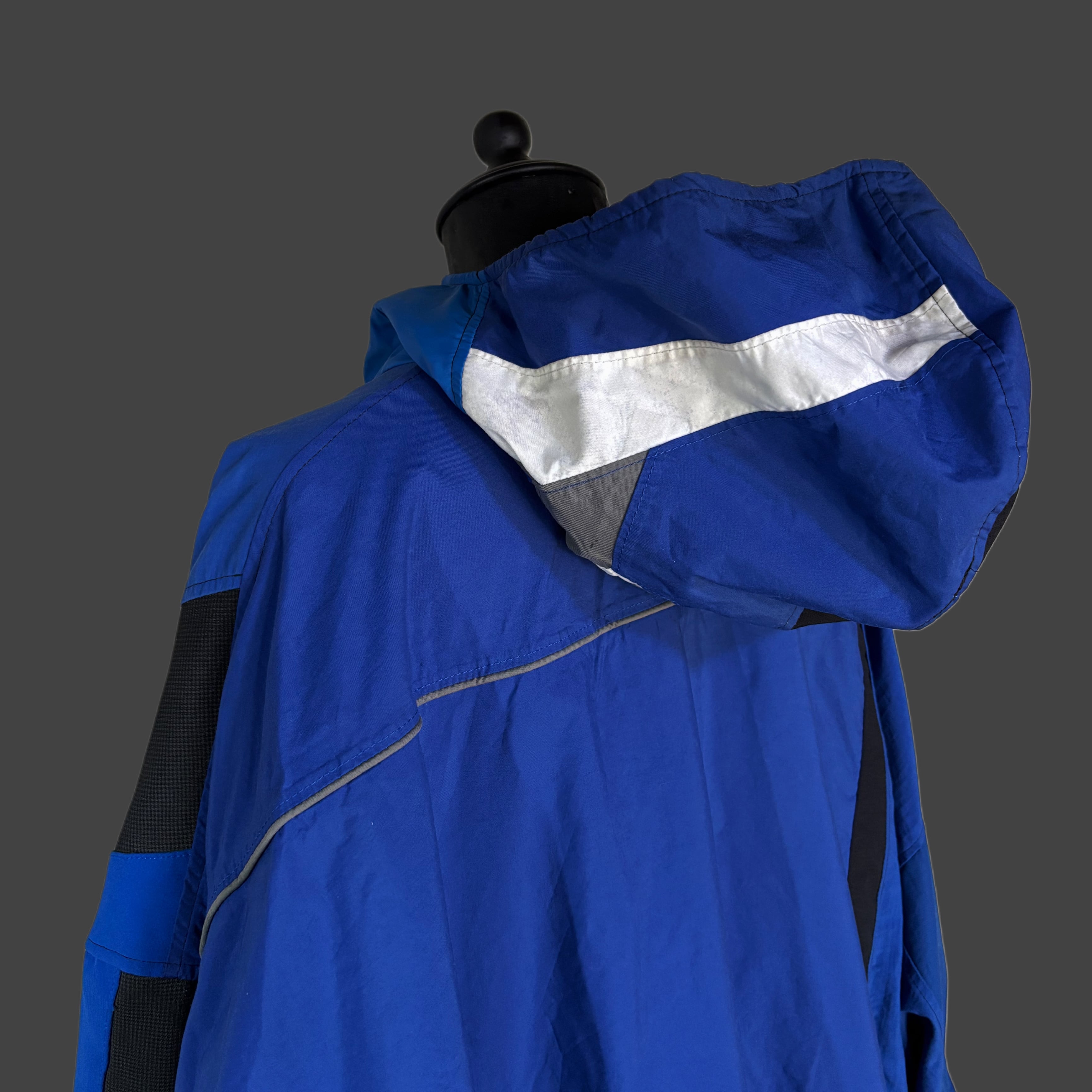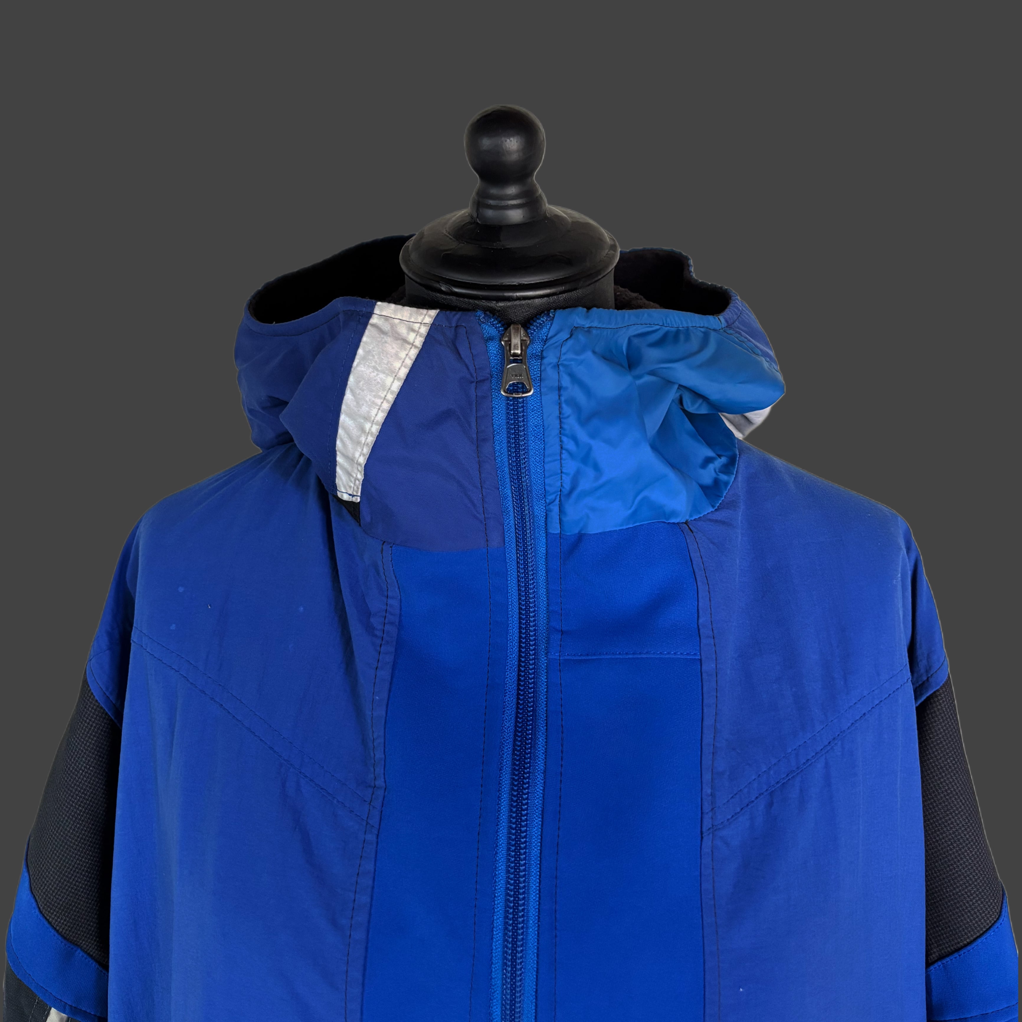 the neckline is slightly snug and the hood is intentionally compact with reduced volume.