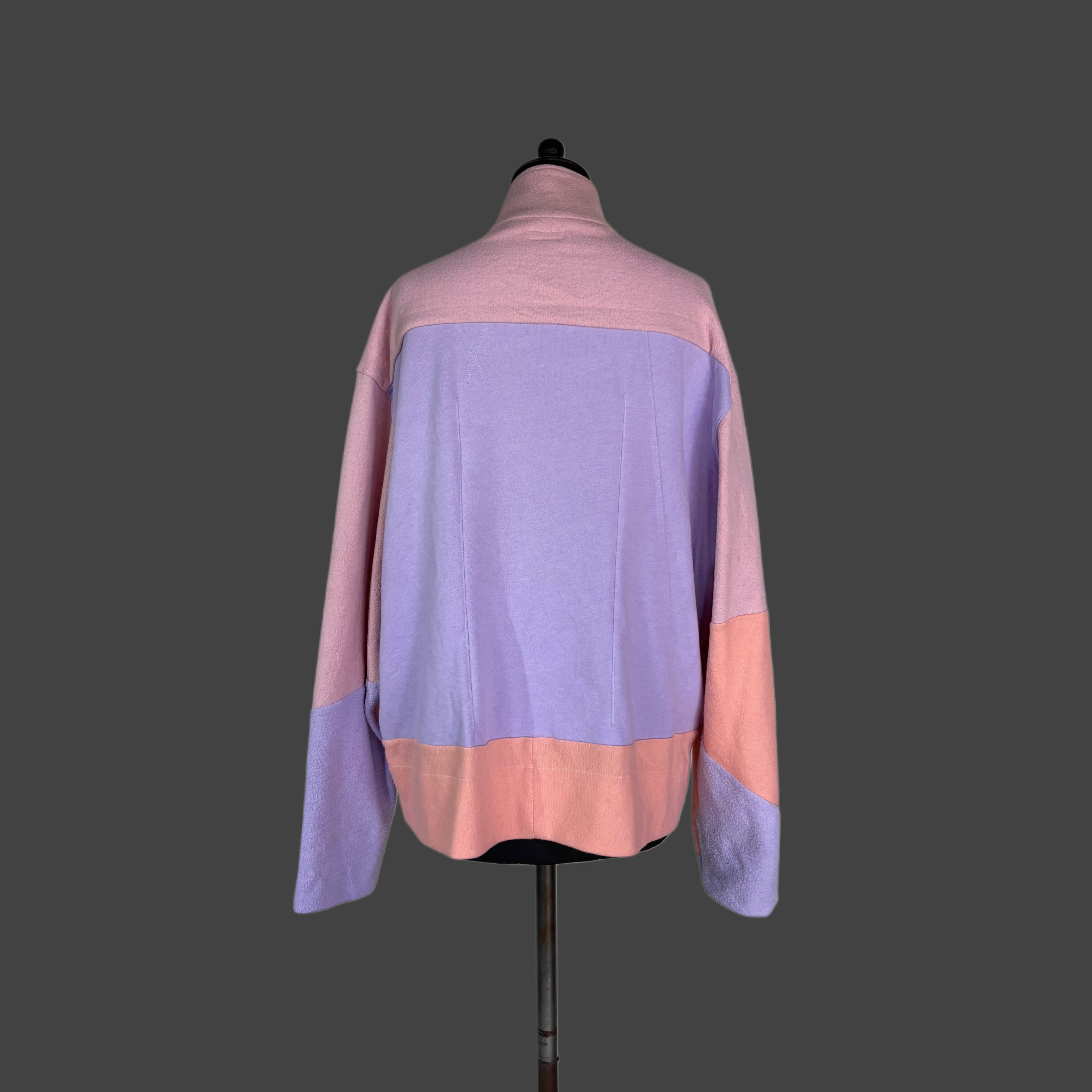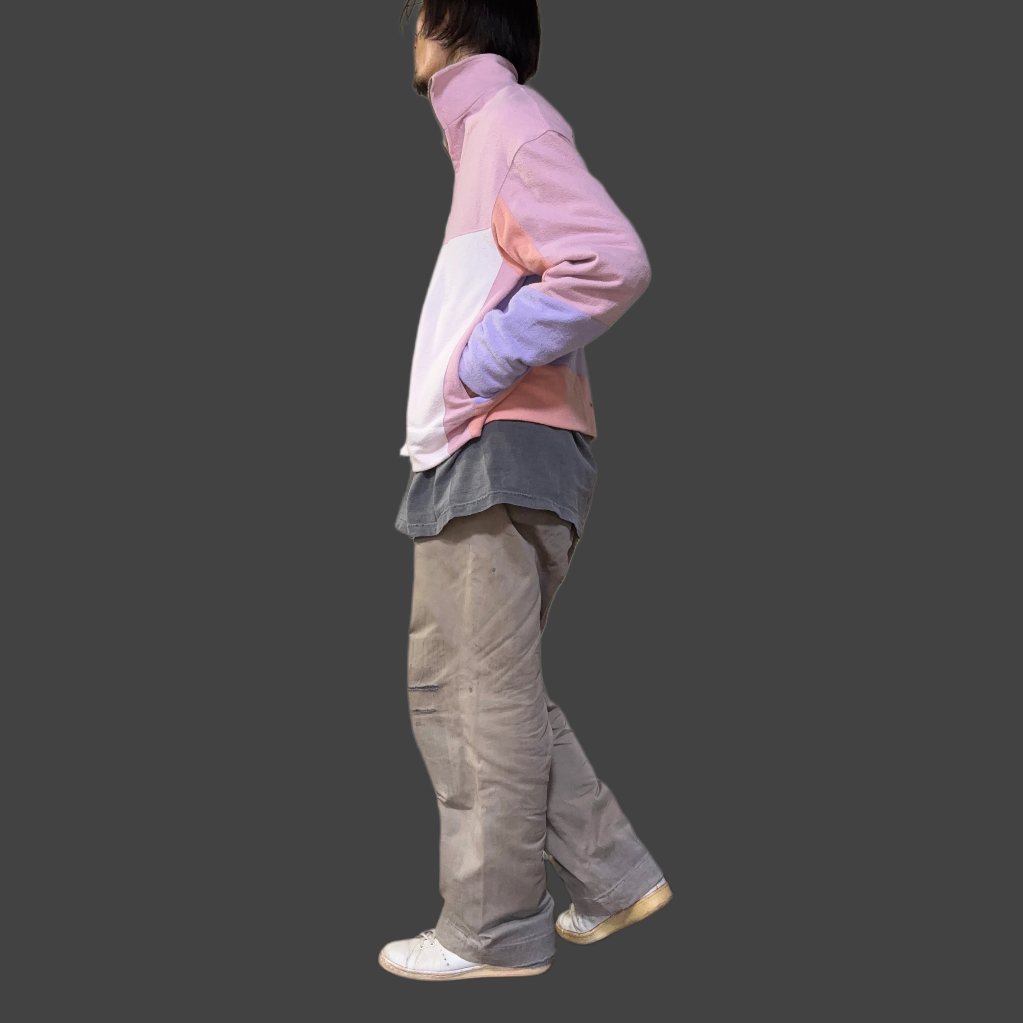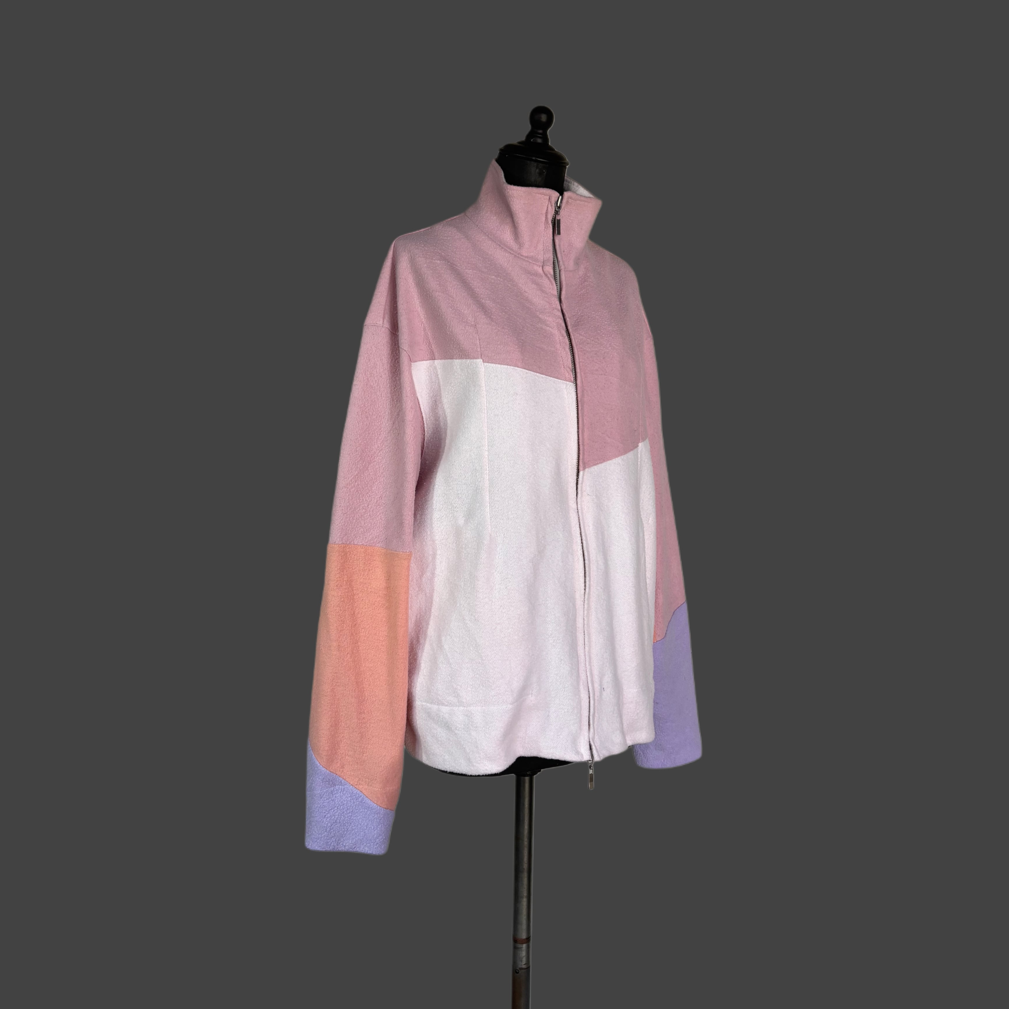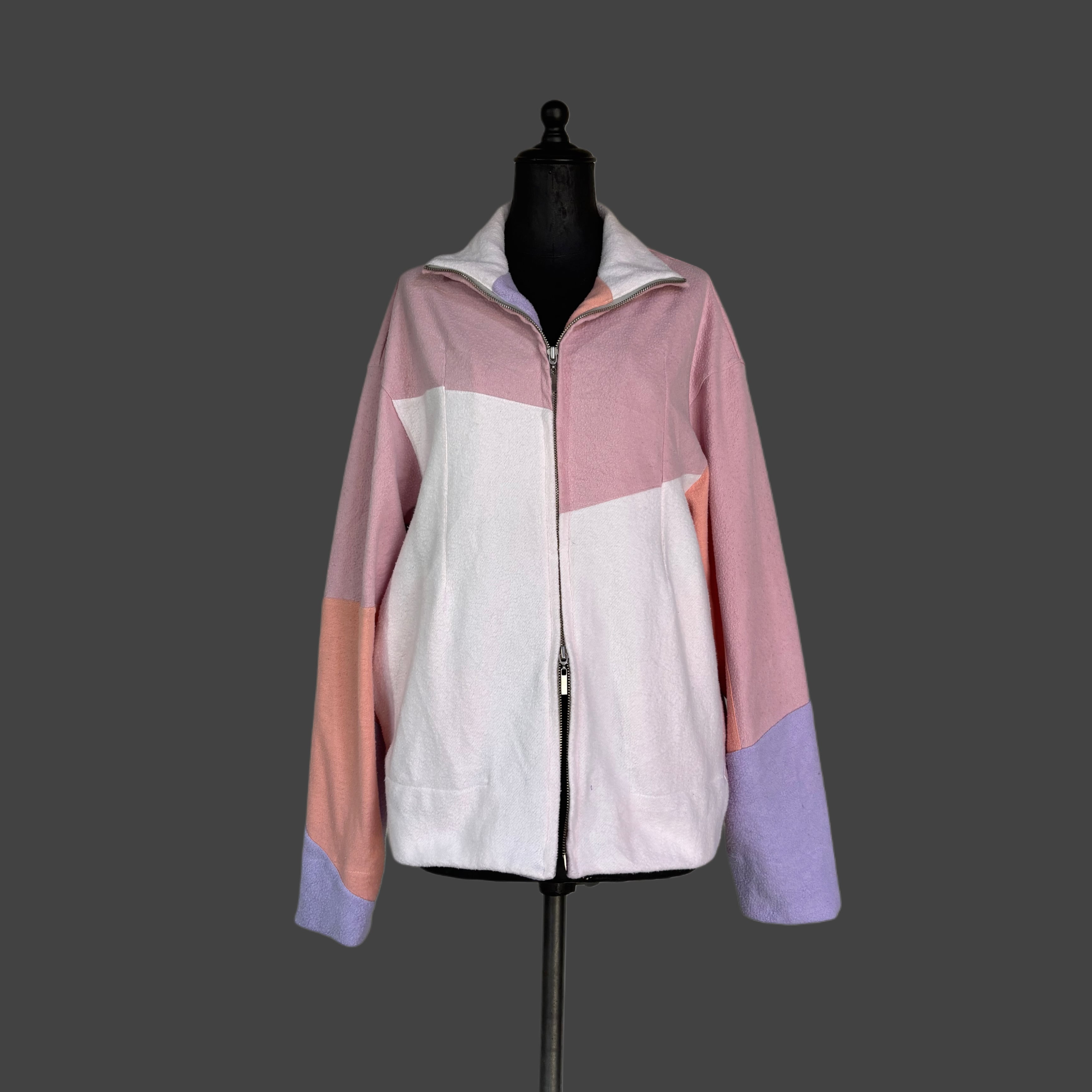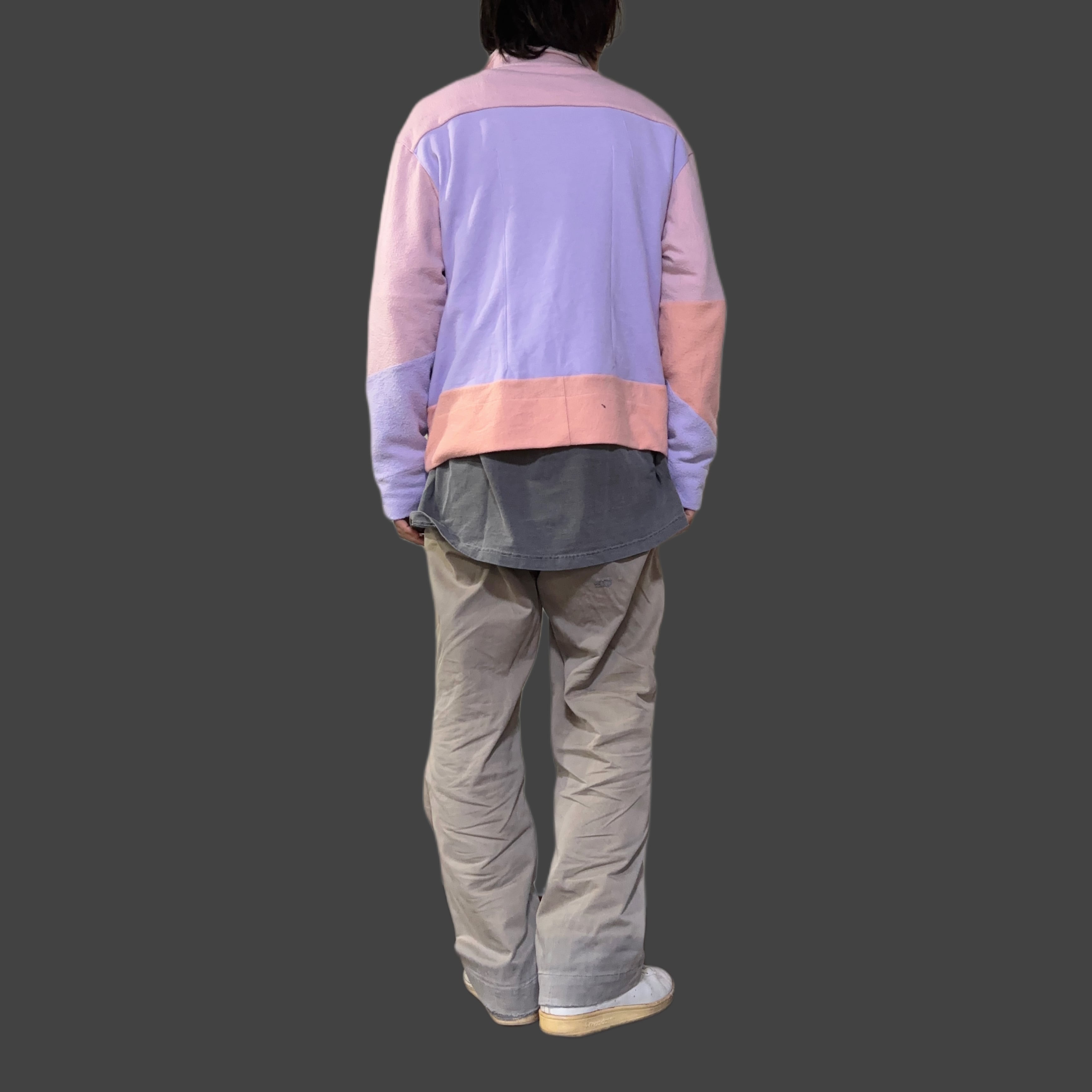 A zip-up top reconstructed from multiple vintage sweatshirts.