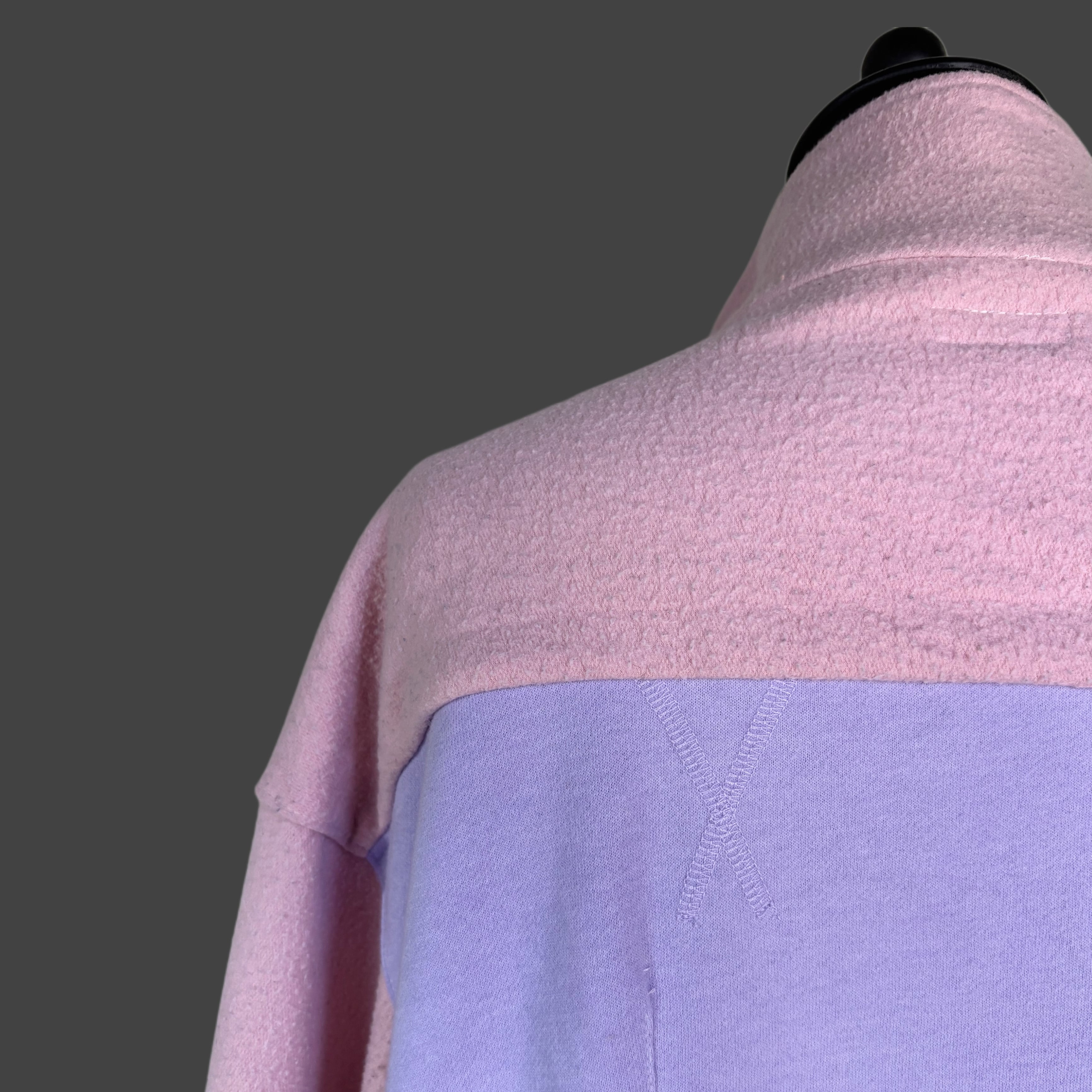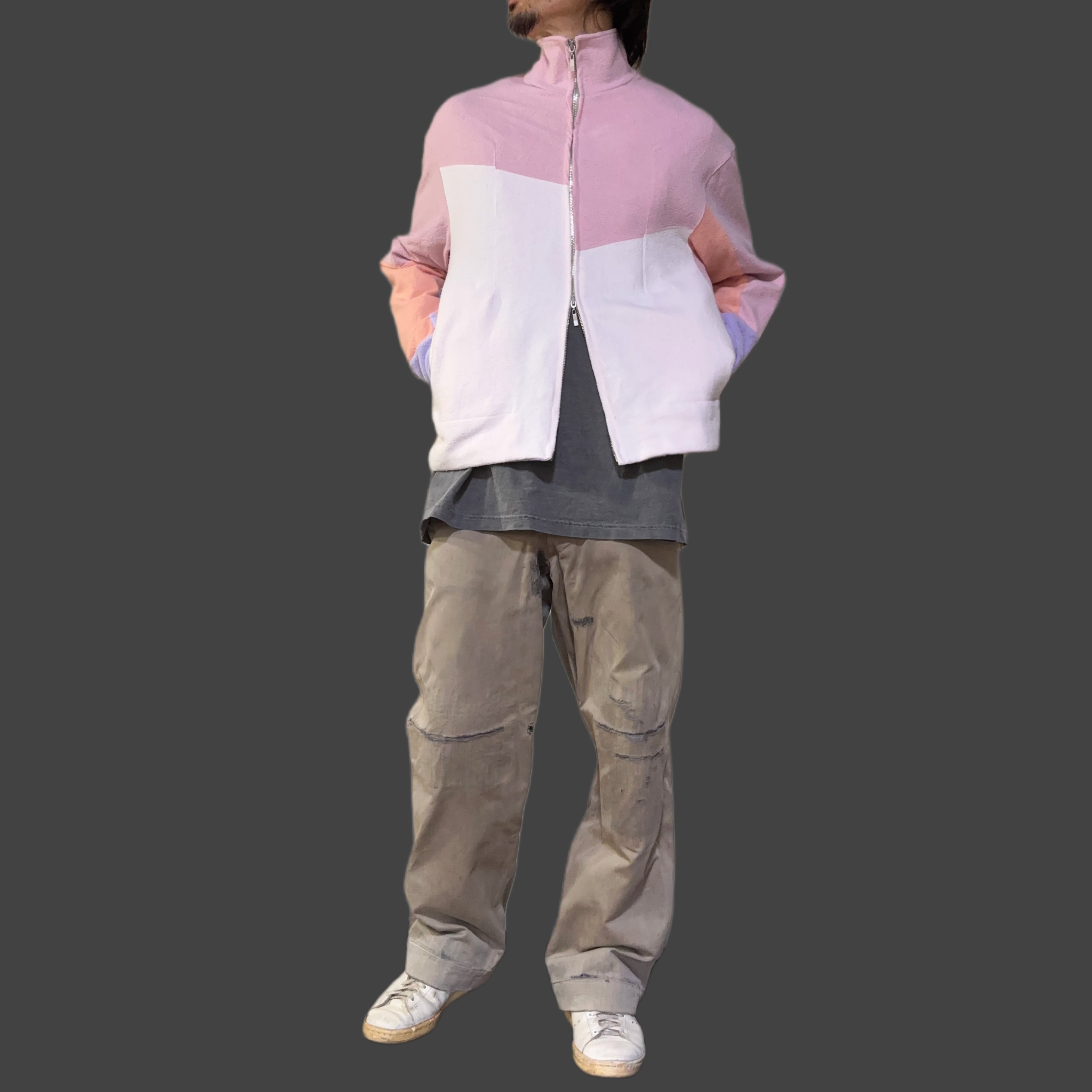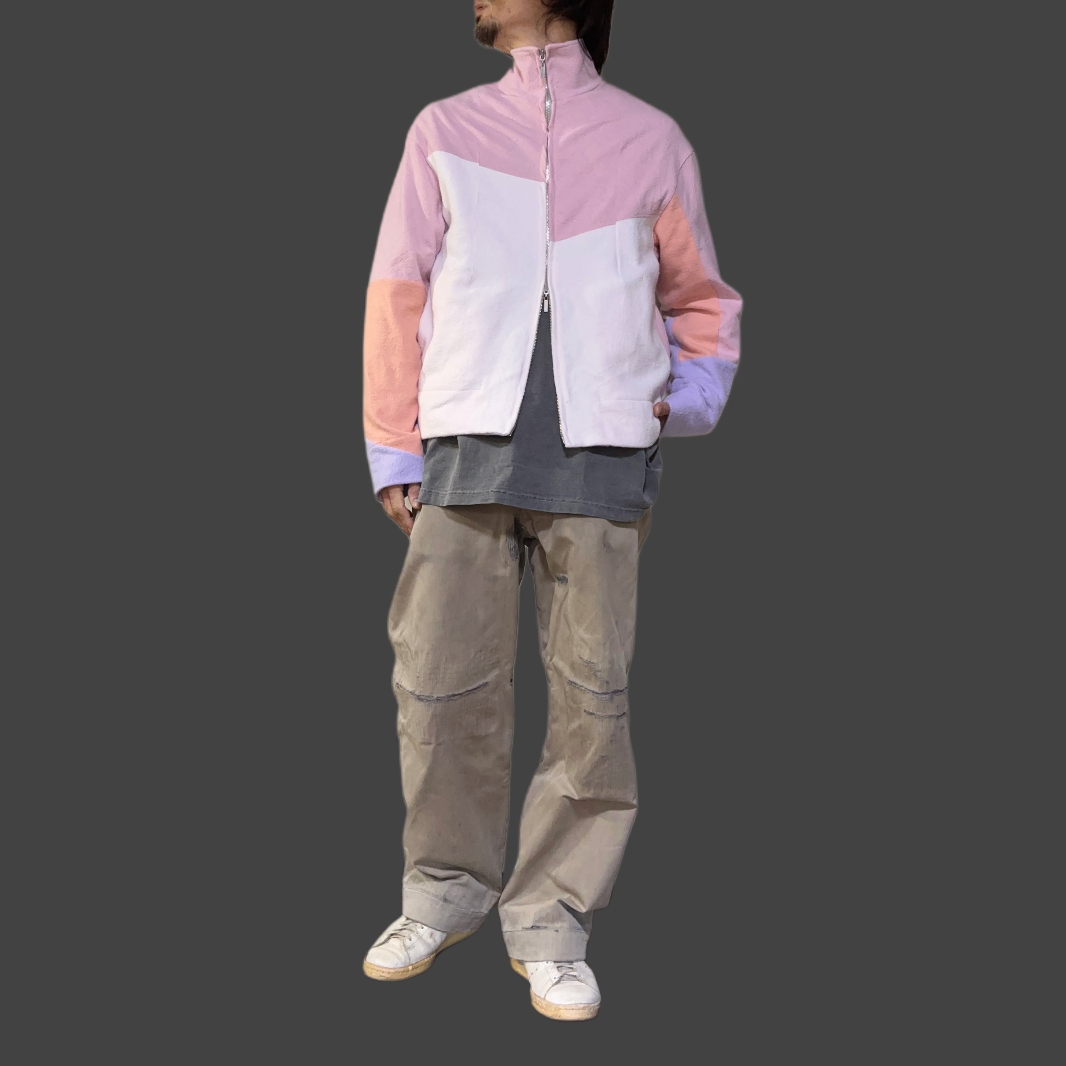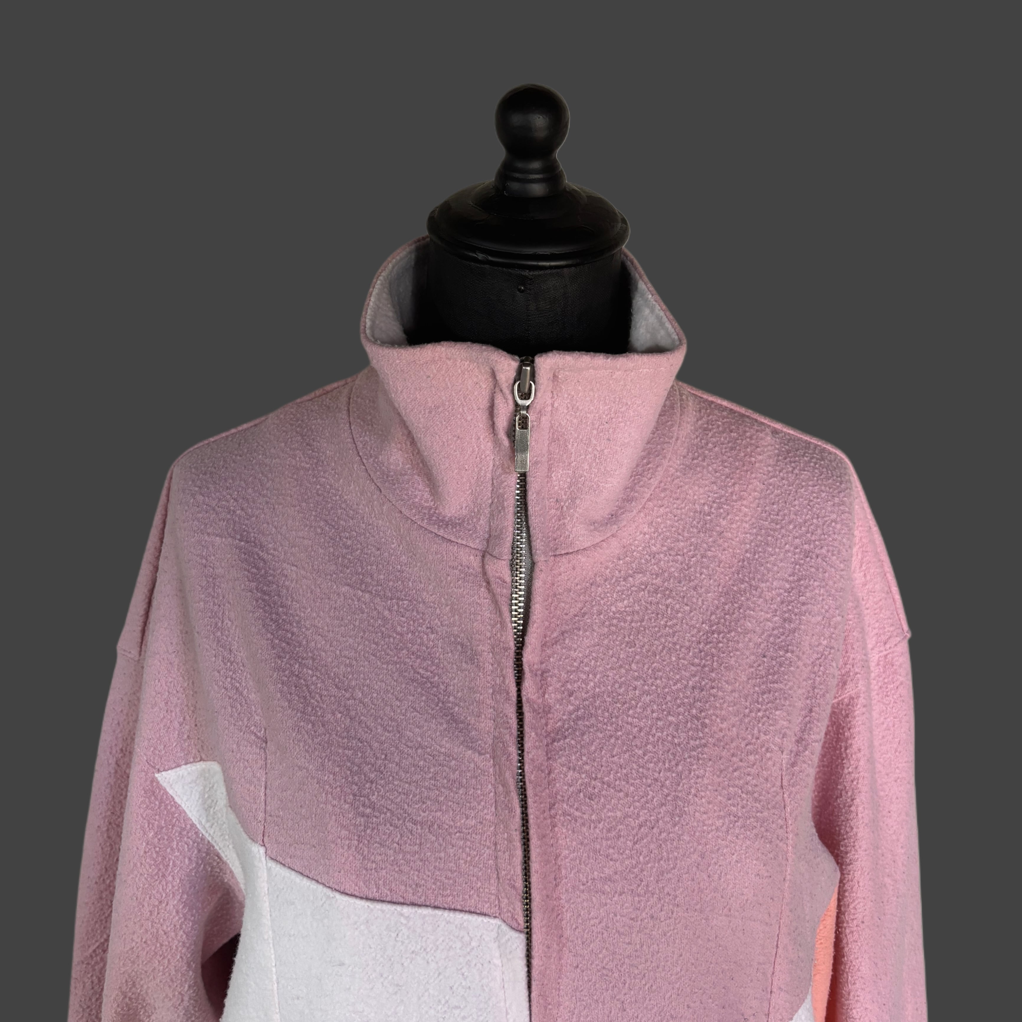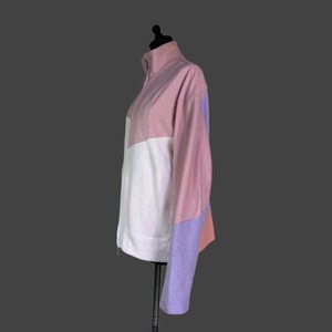 A zip-up top reconstructed from multiple vintage sweatshirts.