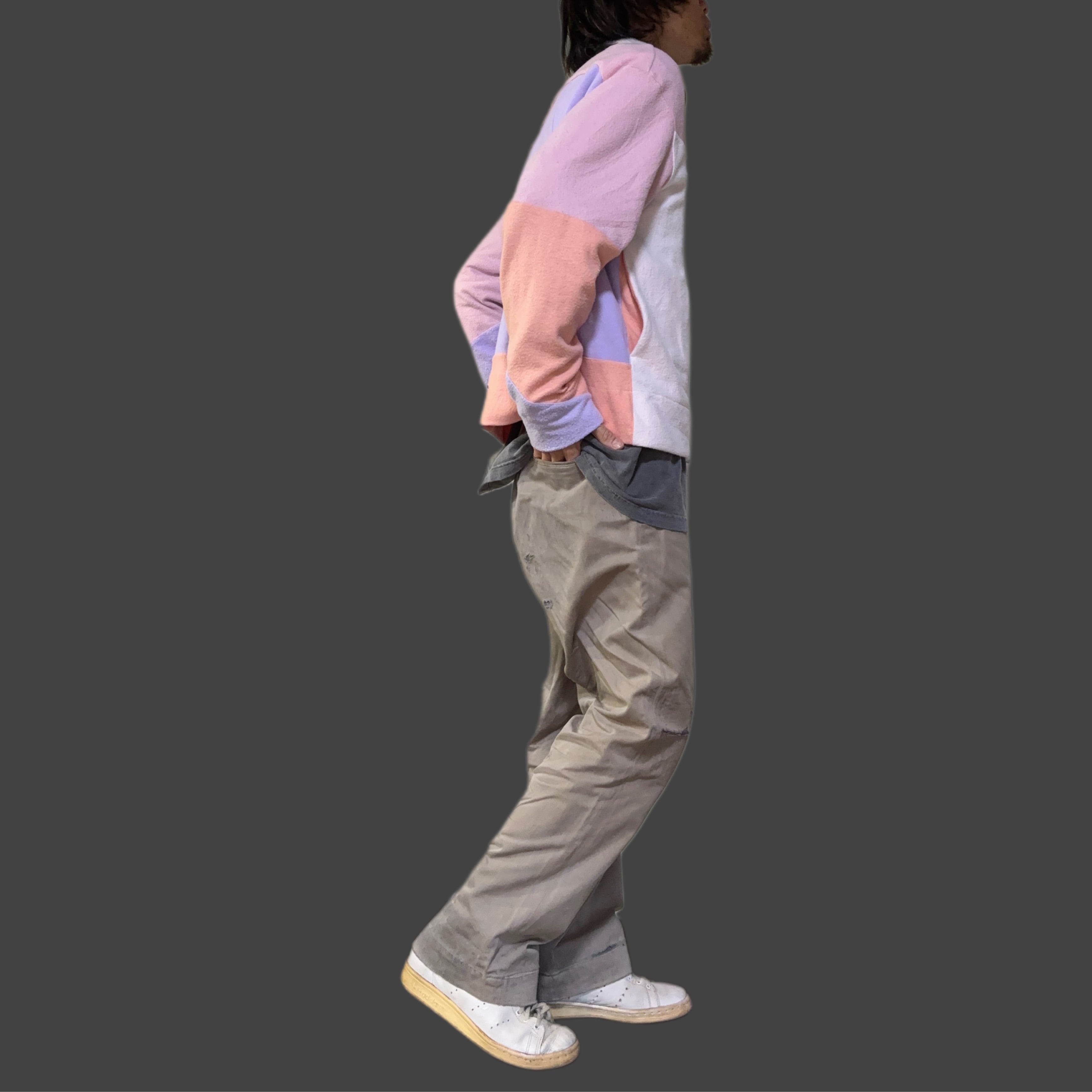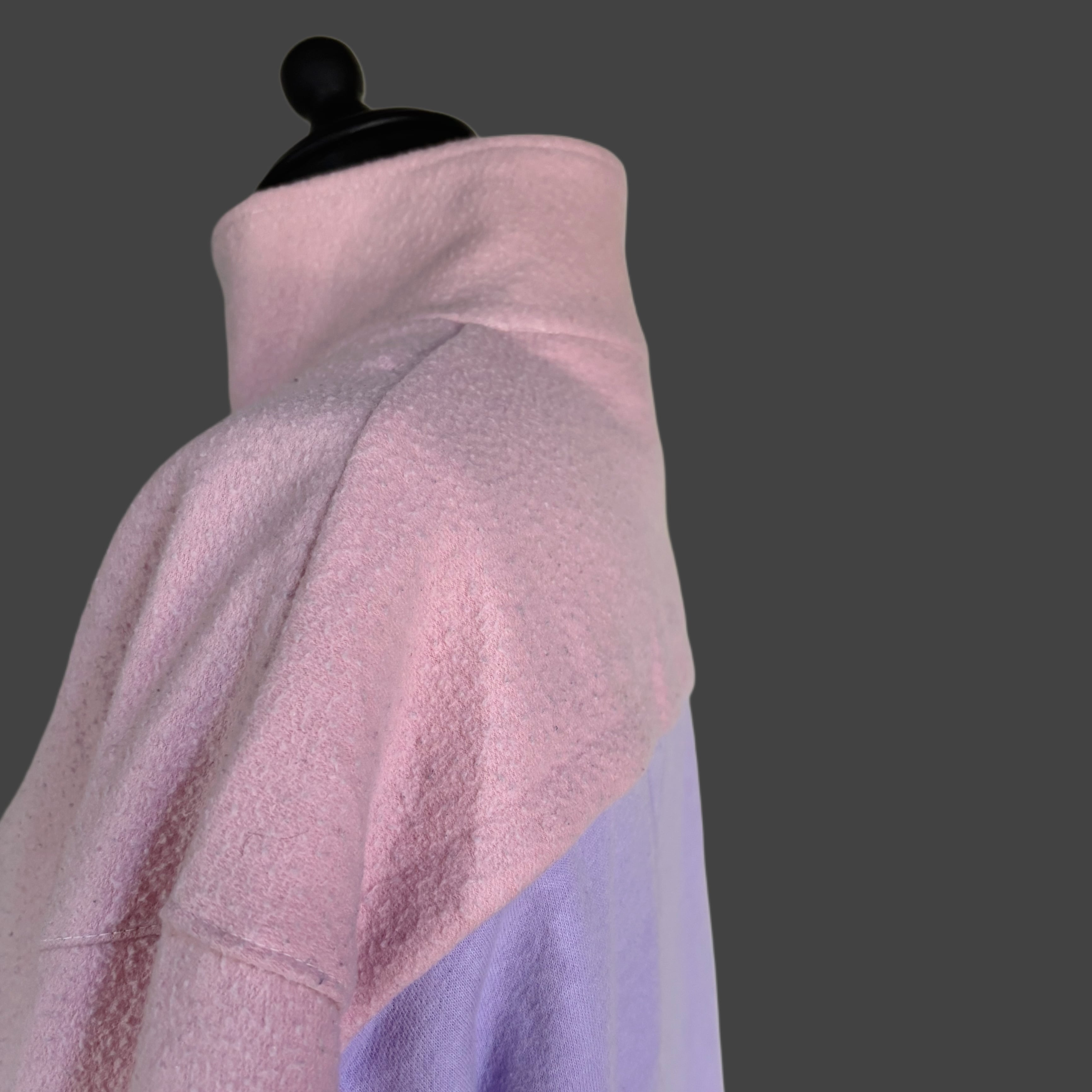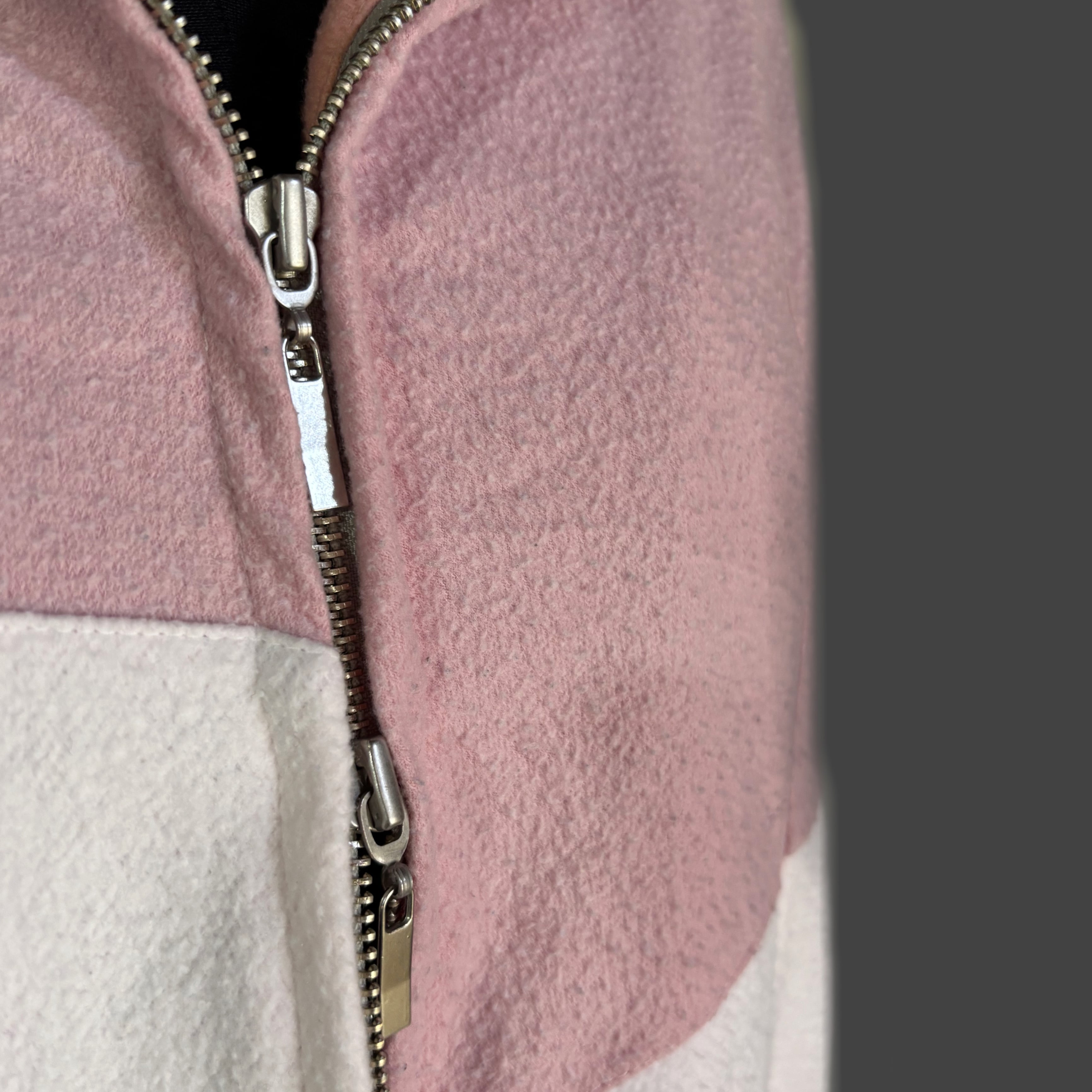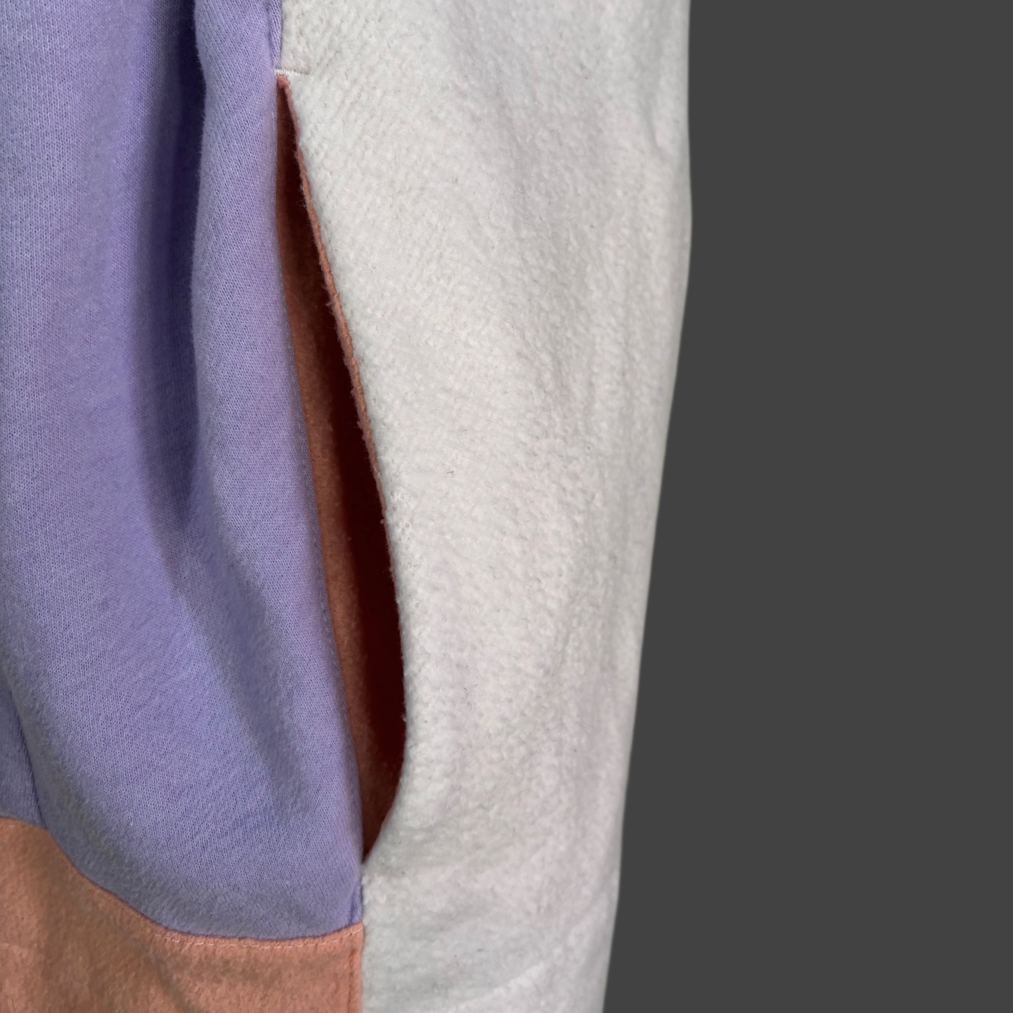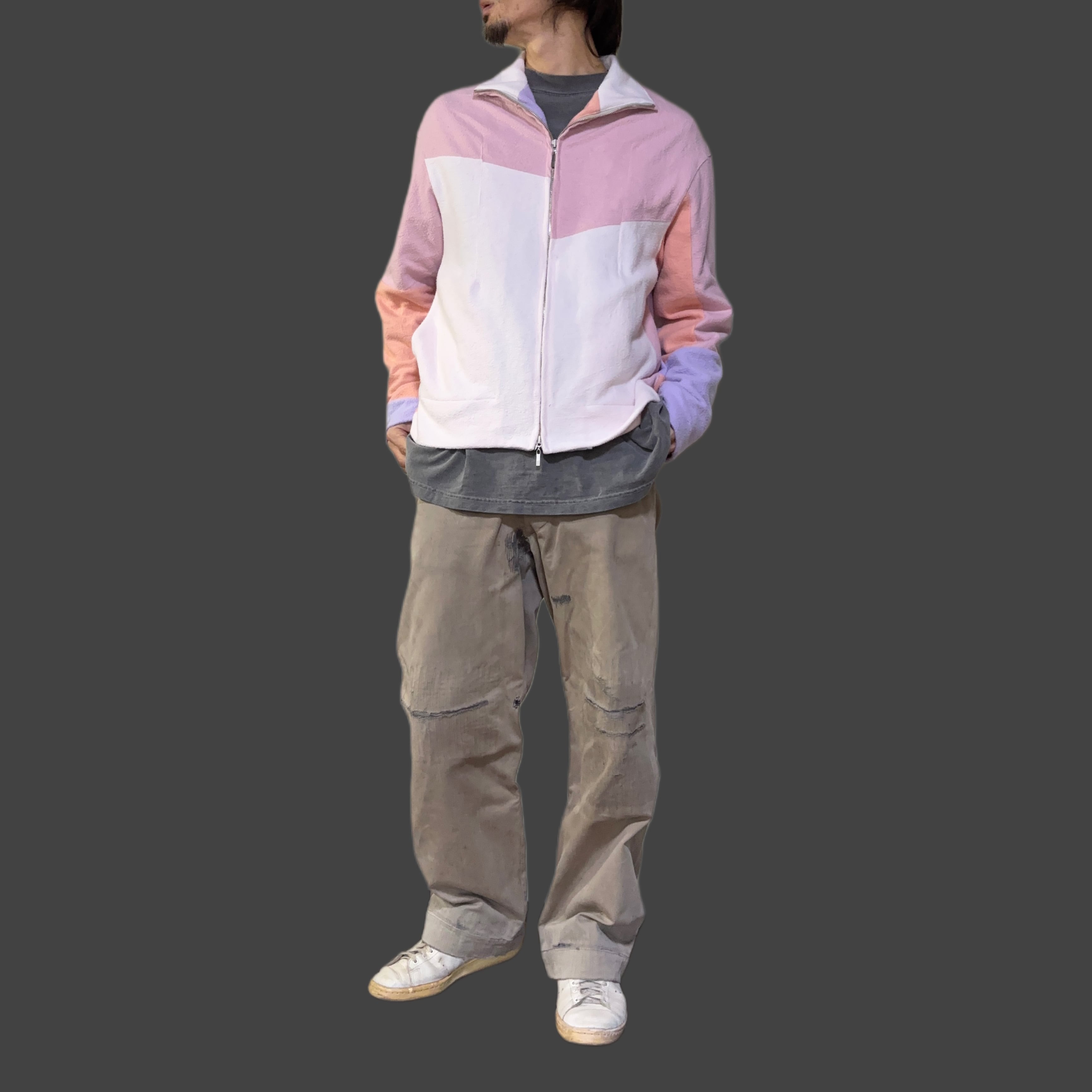 A zip-up top reconstructed from multiple vintage sweatshirts.