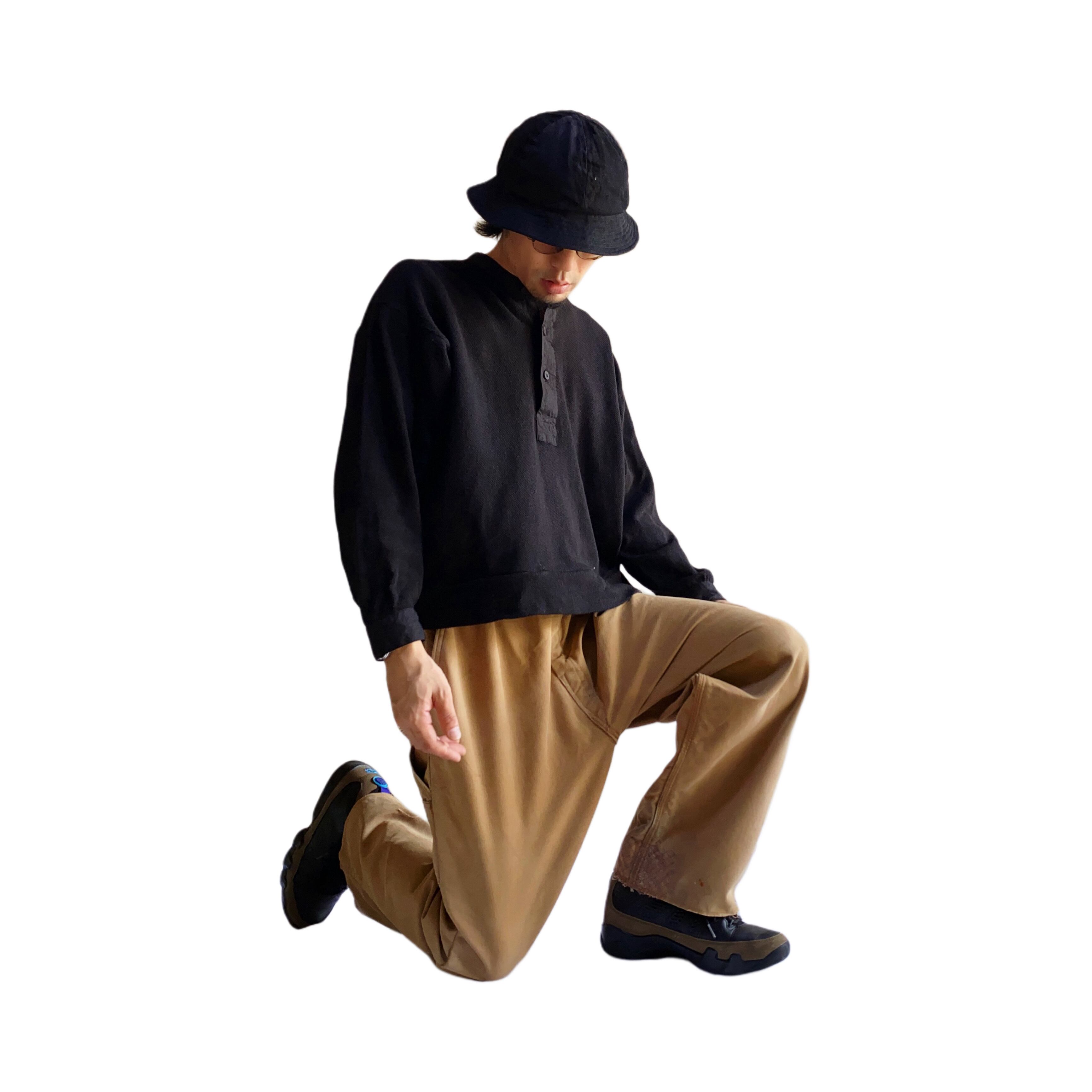 (本品は古い素材に洗いをかけて製作。経年変化は、服の魅力の一部として仕立てています。)